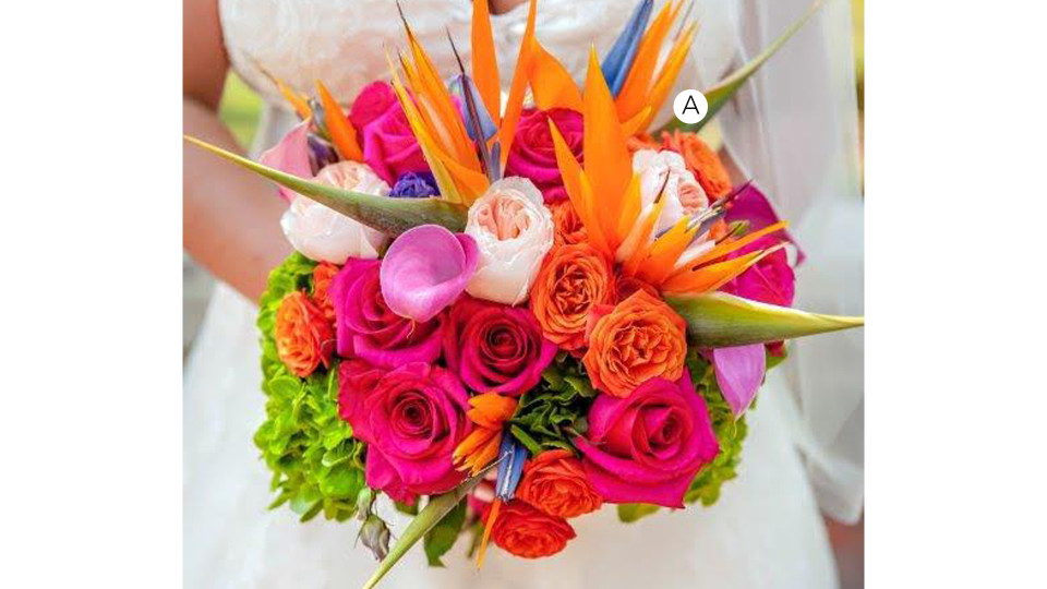 Planning a paradise type wedding? Look no further than this Tropical Paradise wedding flower Package to give the illusion that you're celebrating on an island no matter where or when you're celebrating! Each of the pieces included in this package coordinate with the use of hot pink roses, bright orange miniature roses, birds of paradise, pink calla lilies, bright green hydrangeas and a touch of peach garden roses.